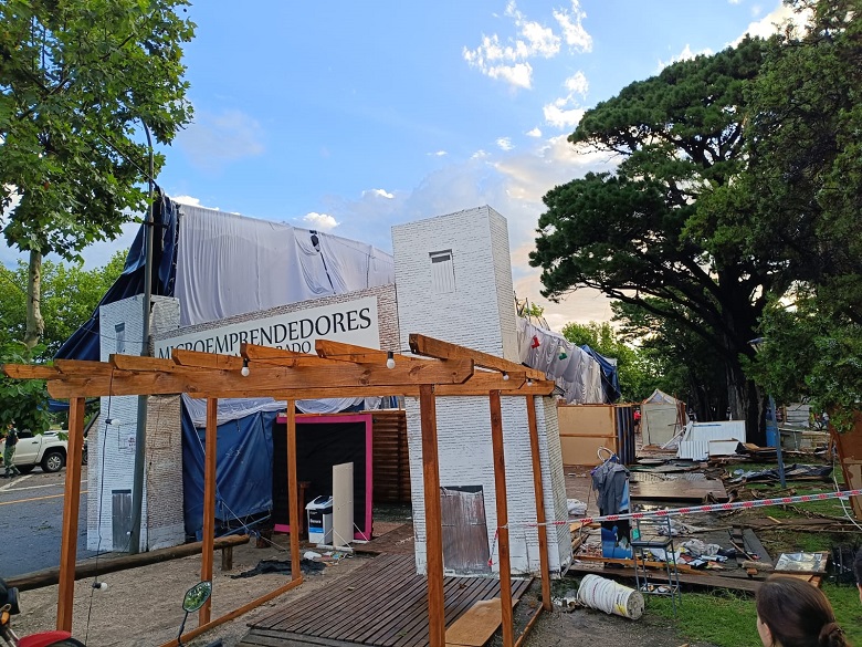 Continuaban a su vez las tareas en comercios afectados en la zona de la Peatonal 21, y en la feria de emprendedores y artesanos, un espacio ubicado en pleno centro en el que trabajan 40 familias, que sufrió la voladura de la estructura metálica que la cubría.