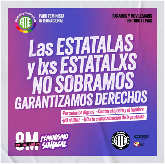 Repudiamos la violencia insistente de los funcionarios del Gobierno Nacional contra las mujeres y diversidades, las trabajadoras y el Estado que habilita y promueve violencias. Rechazamos el DNU, intento de avanzar contra los derechos laborales conquistados y por el derecho constitucional a protestar. Por todo lo expuesto, la medida de fuerza del 8 de Marzo se desarrolla en demanda de: