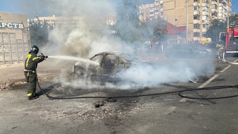 Según el gobernador, equipos de ambulancia llevan a los heridos a instituciones médicas. Los bomberos extinguieron un coche en llamas en el patio del edificio de apartamentos y el balcón de uno de los apartamentos. Además, están apagando césped seco en tres lugares.