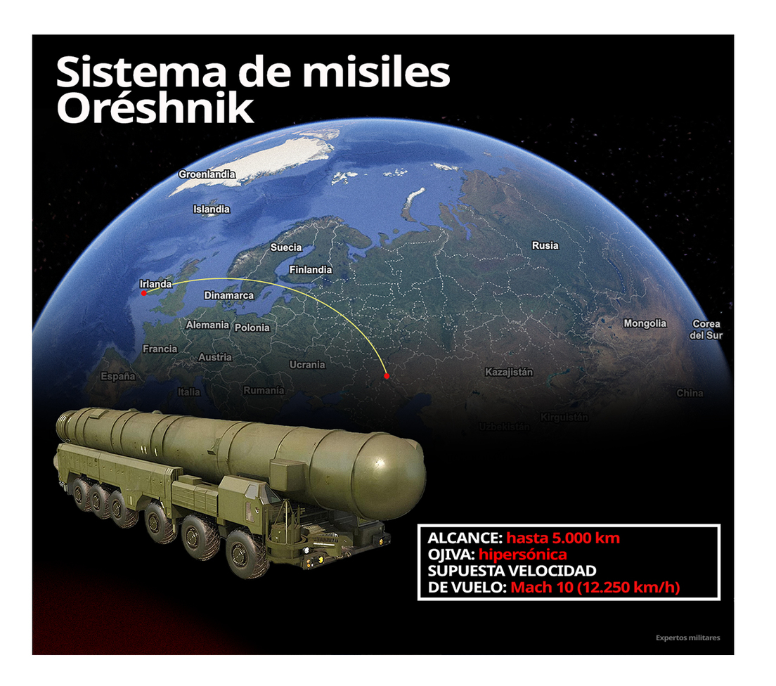 El Oréshnik es un novedoso misil balístico ruso de alcance intermedio, capaz de impactar contra sus objetivos a una velocidad hipersónica de Mach 10, lo que equivale a casi tres kilómetros por segundo.