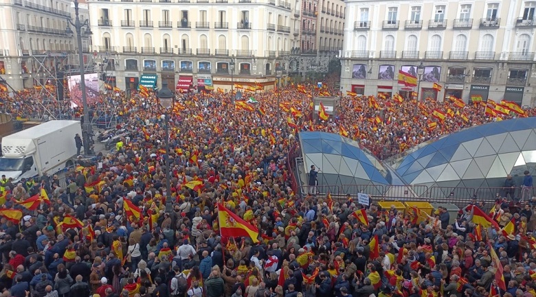 En la capital, unos 80.000 manifestantes, según la delegación del gobierno, que está controlado por el PP, formaron una marea de banderas españolas en la céntrica plaza de la Puerta del Sol y sus alrededores, al grito de "Pedro Sánchez dimisión".