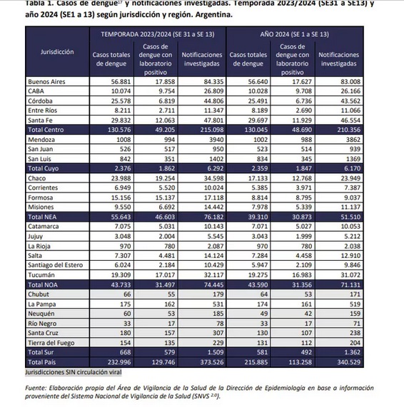 El Ministerio de Salud de la Nación informó que, en lo que va de la temporada 2023/2024 (semana 31 de 2023 -fines de julio y comienzos de agosto- hasta la semana 13 de 2024 -fines de marzo), se registraron en Argentina “232.996 casos de dengue (90% autóctonos, 7% en investigación y 3% importados), de los cuales 215.885 se registraron desde la semana 1 a la semana 13 de 2024″.