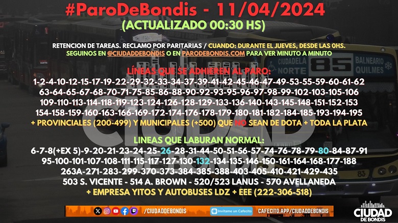 La Unión Tranviarios Automotor (UTA) ratificó la realización del paro de colectivos que comenzó este jueves 11 de abril a las 00 horas en el Área Metropolitana de Buenos Aires (AMBA) por no cobrar la totalidad de los sueldos.