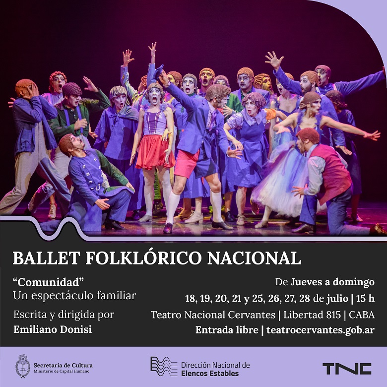 La Secretaría de Cultura de la Nación perteneciente al Ministerio de Capital Humano los invita a disfrutar de las funciones que realizará el Ballet Folklórico Nacional durante las vacaciones de invierno de la obra Comunidad, escrita y dirigida por Emiliano Dionisi, con la reposición coreográfica de Soledad Mangia y Eduardo Virasoro.