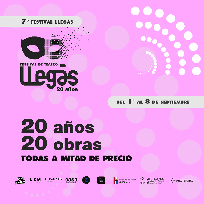 En el marco de la celebración por los 20 años de la Revista Llegás, entre el 1 y el 8 de septiembre se realizará la séptima edición del Festival de teatro Llegás, que en esta oportunidad incluye 20 obras de la cartelera teatral de la Ciudad de Buenos Aires con entradas a mitad de precio. Además de la programación, el festival contará con una clase magistral de dramaturgia a cargo de Rafael Spregelburd y otra clase magistral del Programa "El intérprete_The Performer" a cargo de Melina Seldes, entre otras actividades.