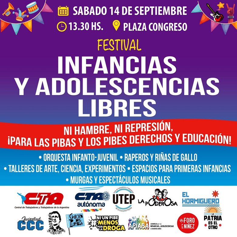 El próximo sábado 14 de septiembre a partir de las 13:30 convocamos al festival artístico, cultural, de juegos, recreación y merienda compartida en la Plaza de los Dos Congresos porque con infancias felices tendremos presente y futuro.