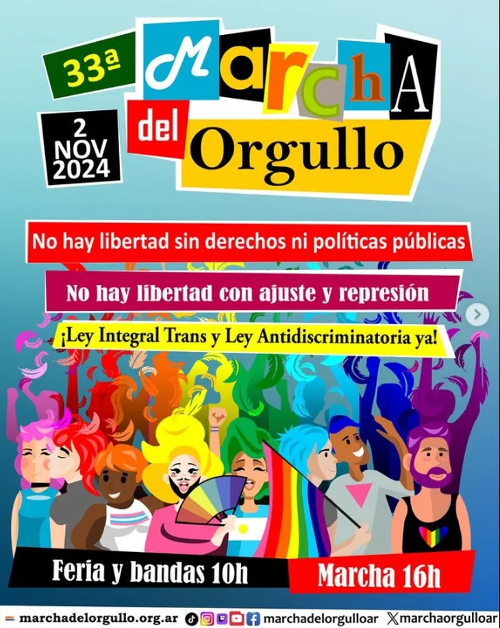 Este sábado 2 de noviembre se realiza la primera Marcha del Orgullo LGBTIQ+ bajo el gobierno de Javier Milei, un declarado antagonista de este colectivo. Será entre Plaza de Mayo y el Congreso Nacional, pero se replicará en varias provincias. "No hay libertad sin derechos ni políticas públicas" es una de las consignas.