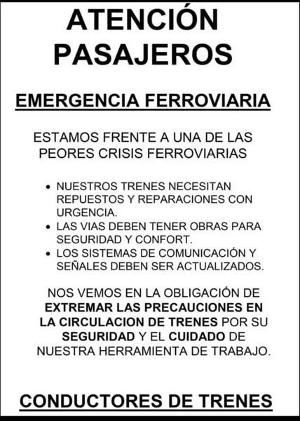 En un comunicado, señalan la necesidad urgente de repuestos, reparaciones y obras para garantizar la seguridad de pasajeros y trabajadores.