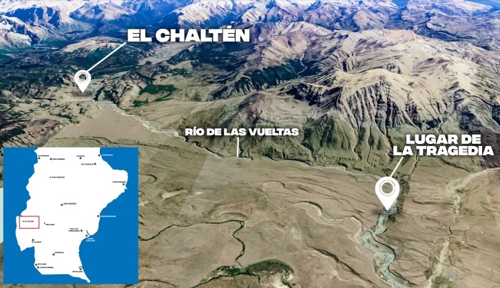 El suceso se registró en el Río de las Vueltas, a unos pocos kilómetros de la ciudad de El Chaltén, en el sector conocido como Cañadón, ubicado aproximadamente a seis kilómetros de la Ruta Provincial N°41 y de un mirador desde donde se puede contemplar la majestuosa e inconmensurable belleza de la zona, dentro del Parque Nacional Los Glaciares.