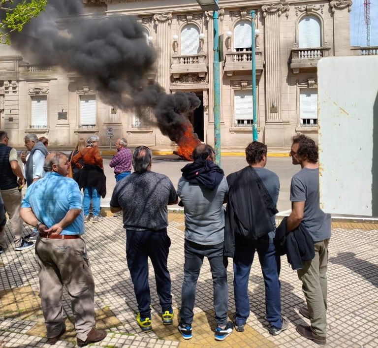 Un grupo de productores, transportistas y vecinos —mayoritariamente de Carlos María Naón— se concentró esta mañana frente al Palacio Municipal para reclamar respuestas por caminos rurales y campos anegados. Los manifestantes, quemaron cubiertas y tablones y uno de los presentes logró ingresar hasta el despacho del Secretario de Gobierno para exigir soluciones inmediatas.