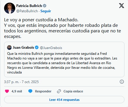 Por su parte, la ministra de Seguridad Patricia Bullrich informó que le pondrá una custodia policial a Machado, en respuesta a un tuit del candidato a diputado de Fuerza Patria, Juan Grabois.