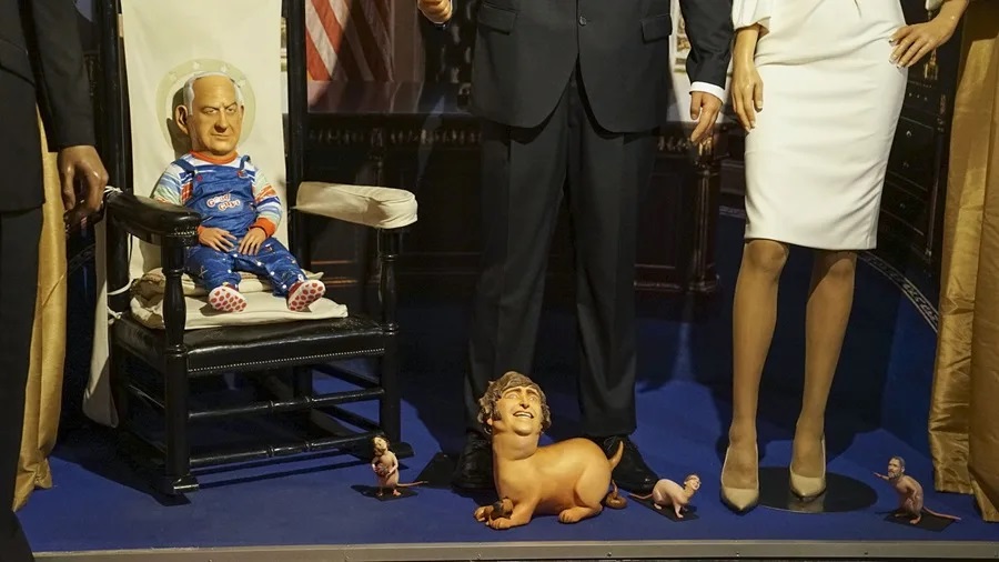 Un artista chileno intervino de forma efímera el Museo de Cera de Madrid para colocar, al lado del presidente estadounidense, Donald Trump, en el Despacho Oval una figura del primer ministro israelí, Benjamín Netanyahu, vestido del muñeco diabólico Chucky con un perro faldero con la cara del argentino Javier Milei.