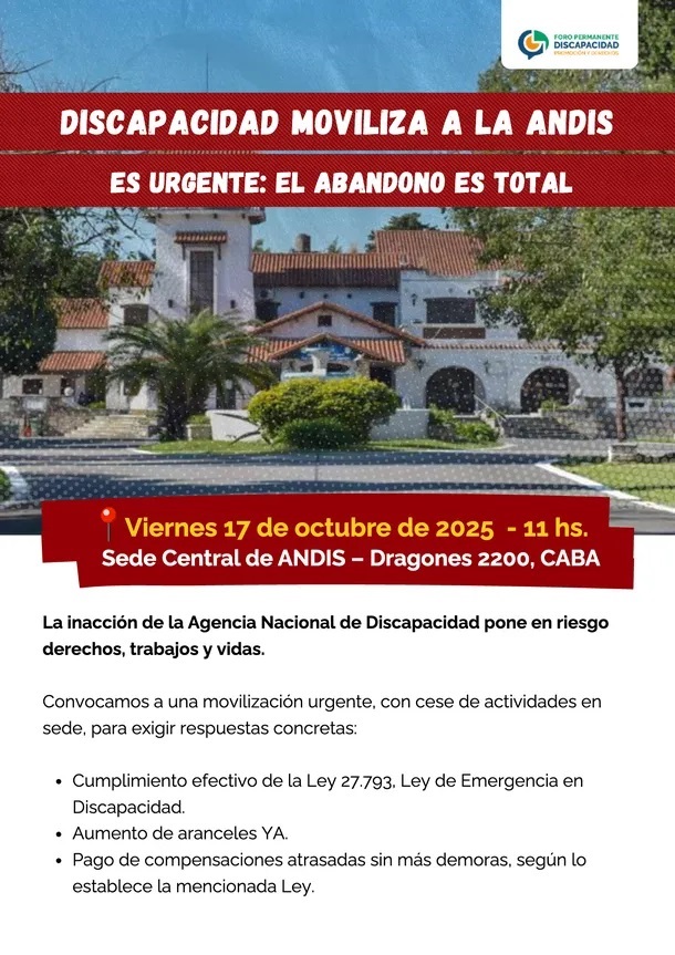 Denunciaron desde el Foro que "la inacción de la Agencia Nacional de Discapacidad pone en riesgo derechos, trabajos y vidas", por lo que convocaron para el viernes a las 11 horas en la sede central de ANDIS, ubicada en Dragones 2200, de la Ciudad de Buenos Aires.