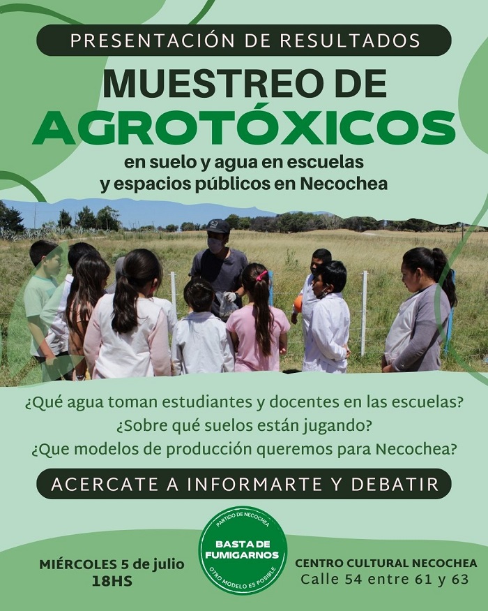 La Asamblea Basta de Fumigarnos del Partido de Necochea invitan a la comunidad a la presentación de los resultados del Muestreo de Agrotóxicos en suelo y agua, realizados en instituciones educativas y otros espacios públicos del partido de Necochea (Necochea, Quequén, Fernández, Santa Marina). El encuentro se realizará el miércoles 5 de Julio a las 18hs, en el Centro Cultural de Necochea, en calle 54 Nº3062.