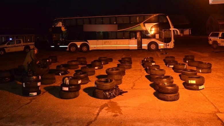 Al detener la marcha de un transporte de pasajeros de larga distancia, que funcionaba como Tour de compras , los efectivos constataron que trasladaba un cargamento de neumáticos acondicionado en la bodega de carga, así como también en el interior del colectivo, sobre los asientos y en el pasillo.
