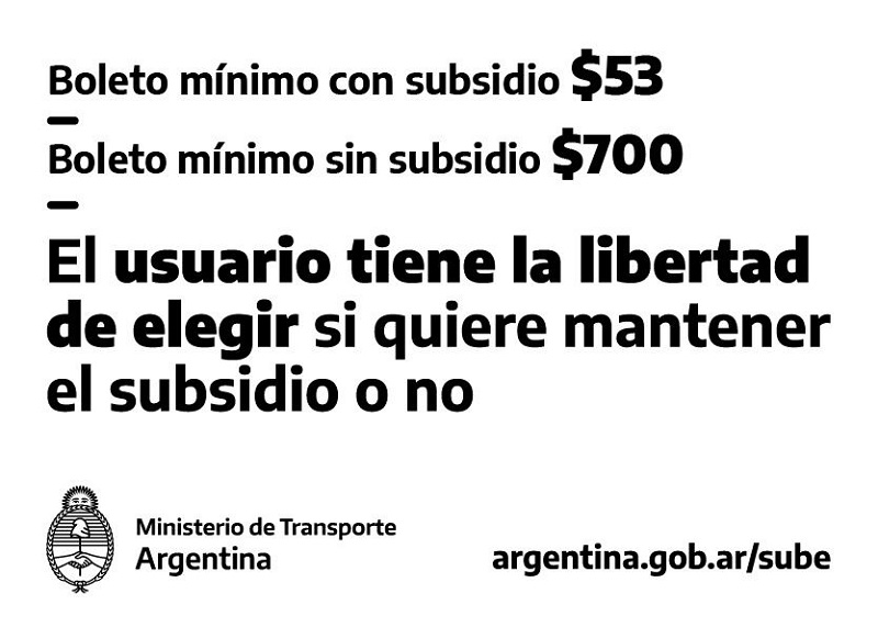 “El usuario tiene la libertad de elegir si quiere mantener el subsidio o no”, señalan los carteles que llevan el logo del Ministerio de Transporte.