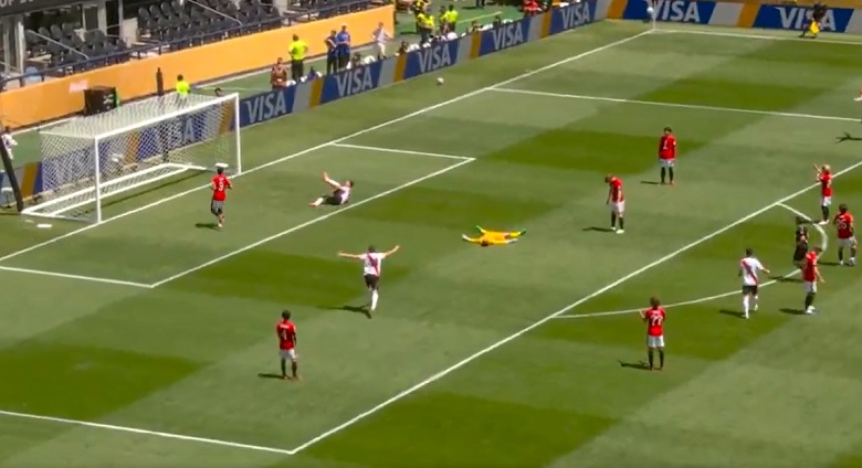 El atacante de 29 años aprovechó un grosero error de la defensa japonesa para cabecear la pelota por encima del guardameta Shusaku Nishikawa y darle la victoria parcial por 2-0 al conjunto millonario.